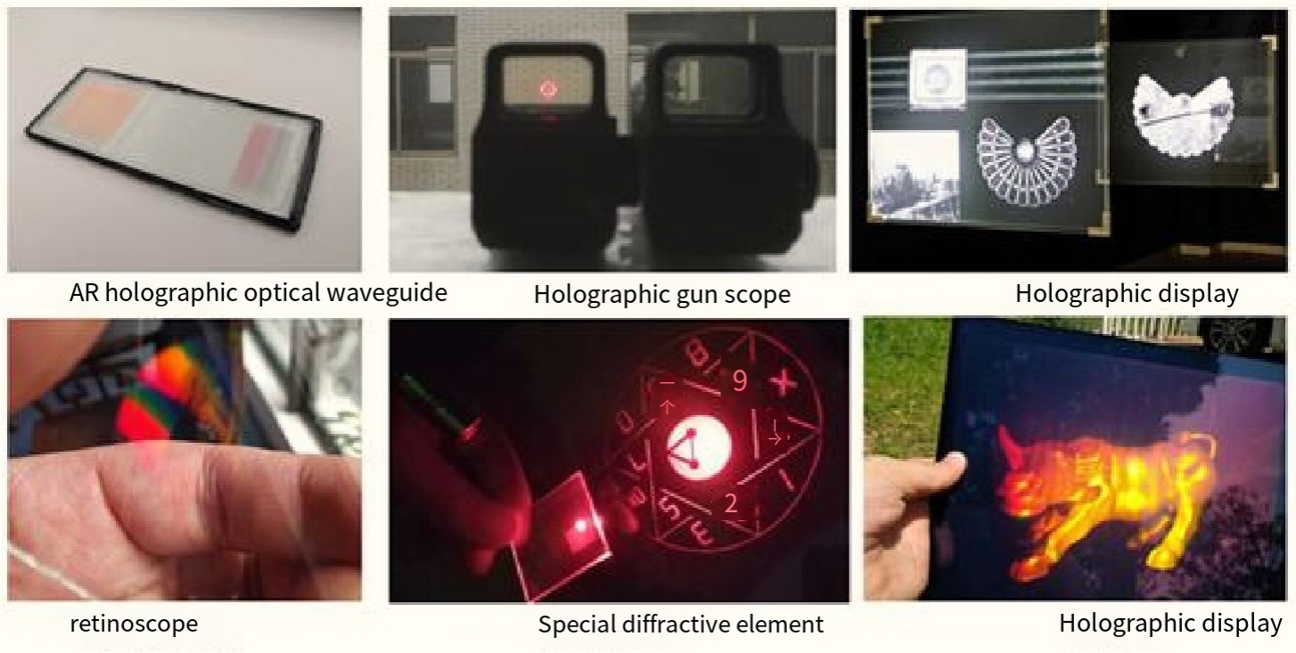 Holographic optical waveguides based on holographic light field information recording materials are the mainstream optical solutions for global AR optics today, the next generation of computing interaction platforms, the core key to the next thirty years of civilization, and the basic core components of AR. In the field of AR, they are optical components with a higher strategic level than chips, and are widely used in industrial and consumer AR smart glasses, single-soldier combat helmets, traffic police helmet displays, armored vehicles and flight 360-degree surround aiming helmets, vehicle-mounted and airborne HUDs and other fields.